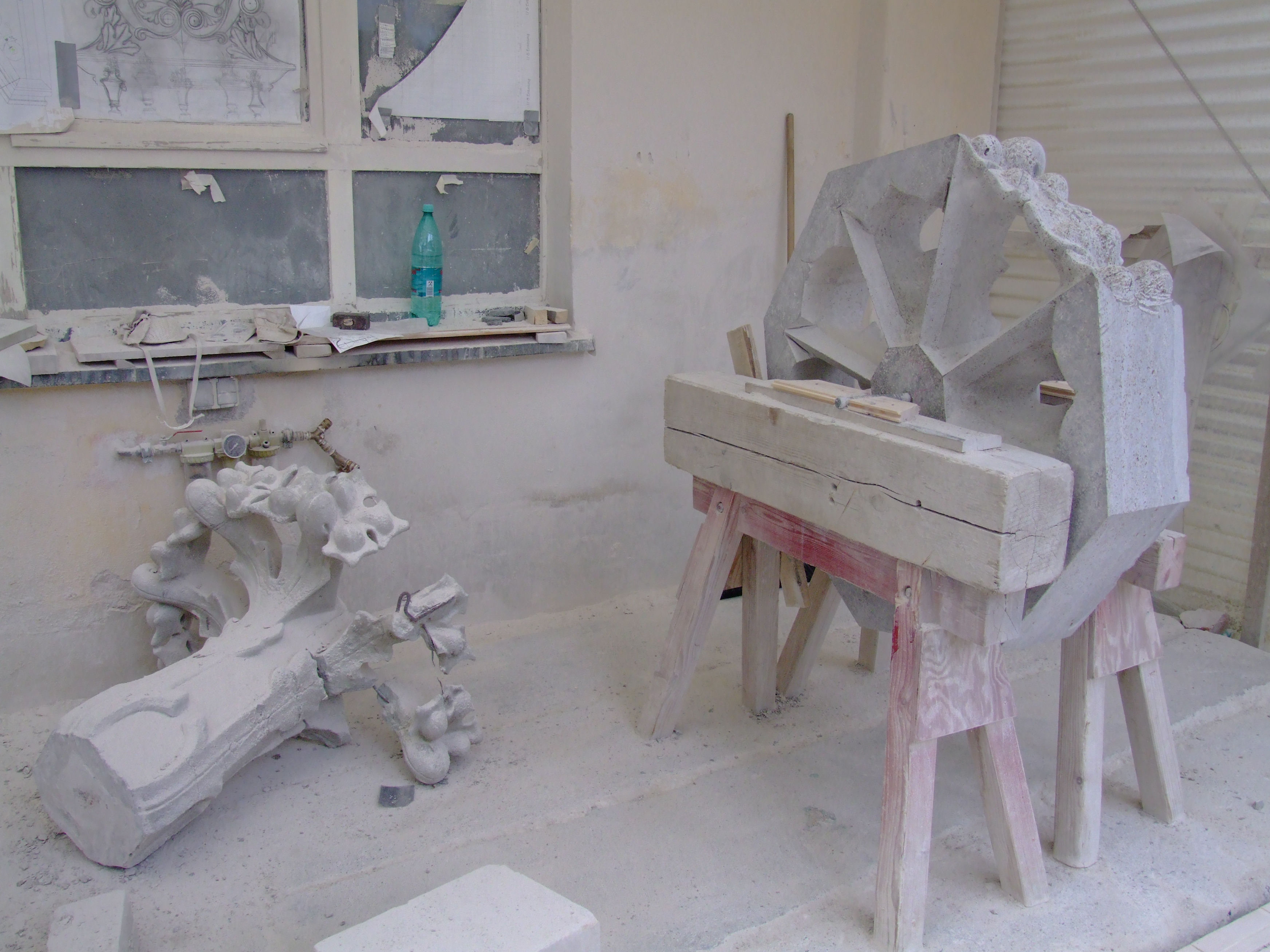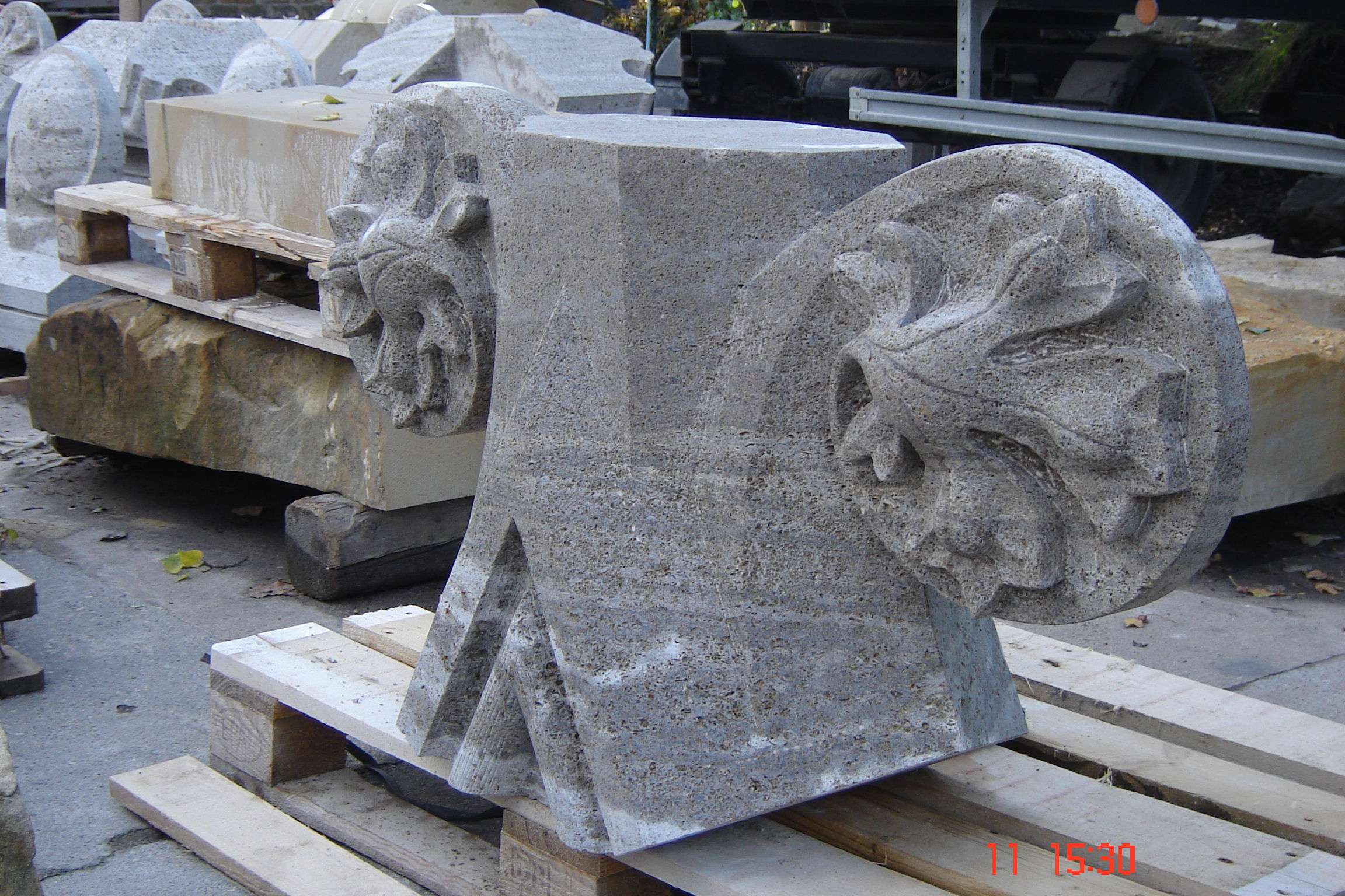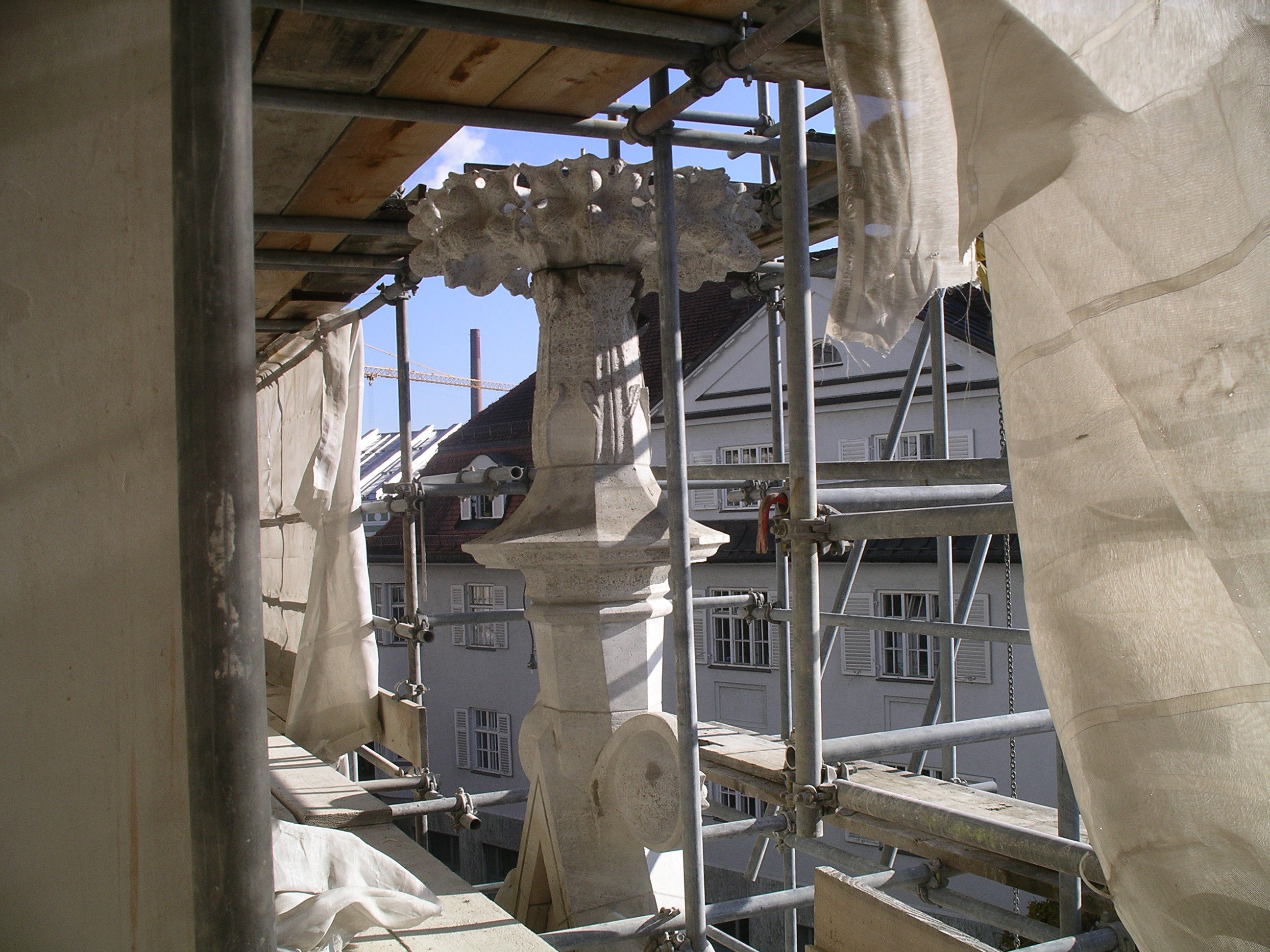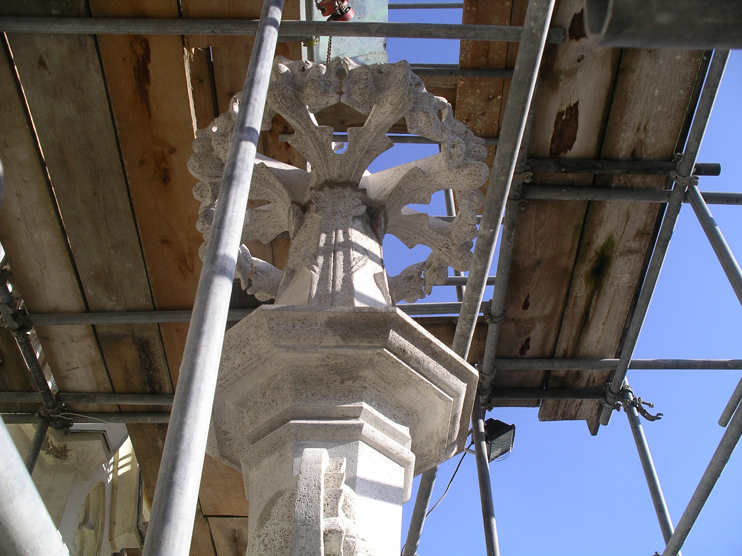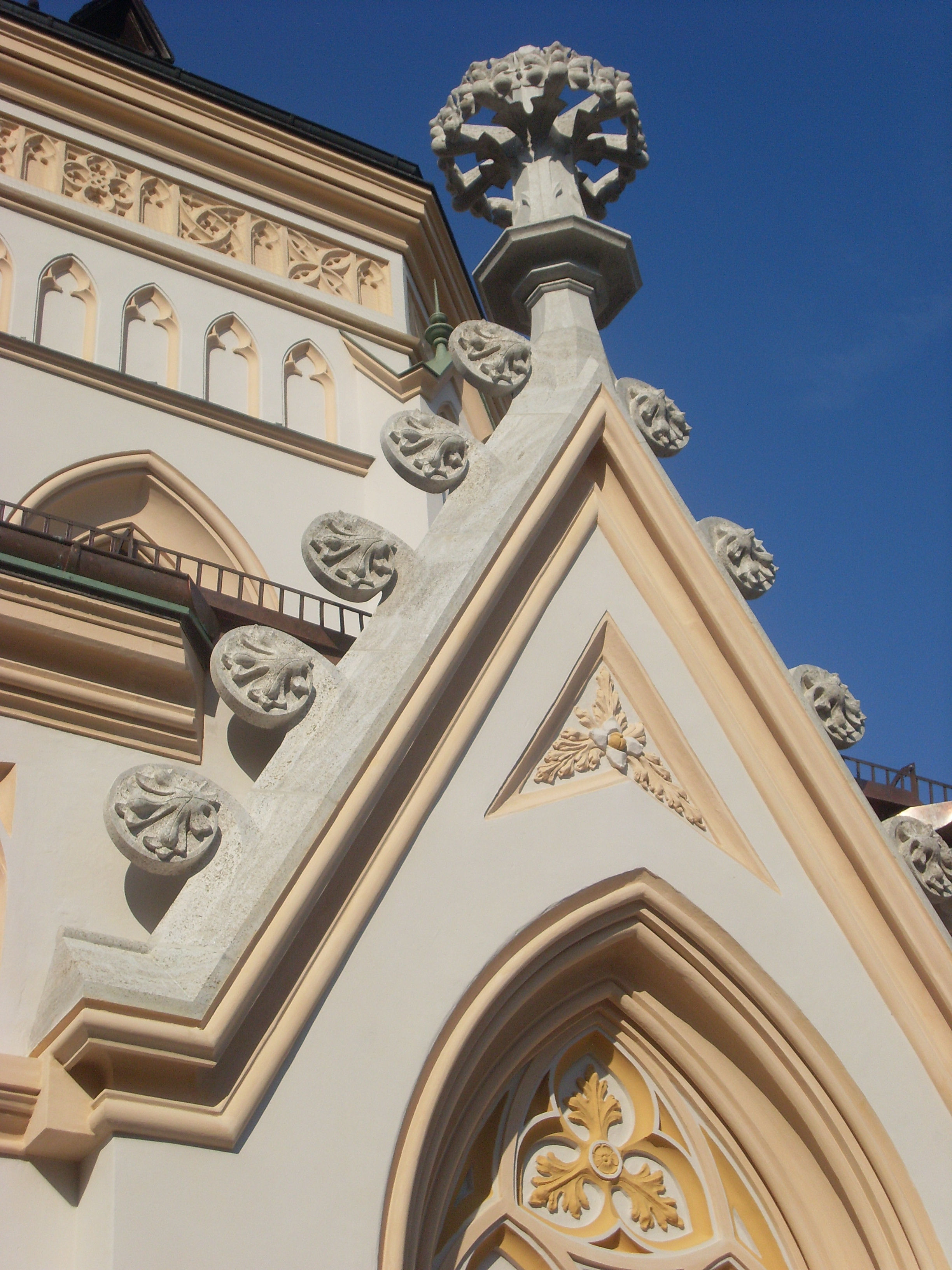 Aufgabe: Rekonstruktion und Neuanfertigung des dritten gotischen Wimperggiebels, Haupteingang Sakristei (besteht aus Krabbensteinen und Kreuzblumen)